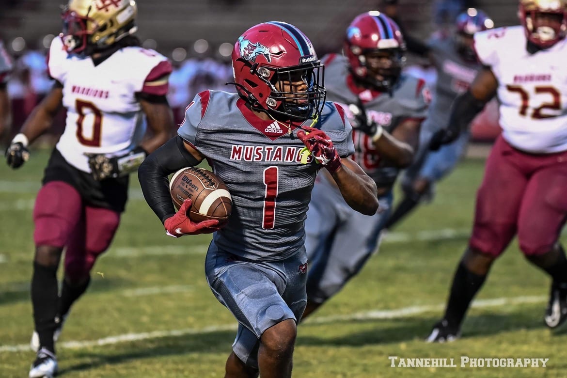 The visiting Warriors struck quickly in the 2nd half, scoring on a 48-yard touchdown pass, but they missed the extra point. On the ensuing possession, Bryant connected on passes of 25 and 13 yards, before Thomas scored his first rushing touchdown of the night from 7-yards out. The Mustangs lead was 21-13.