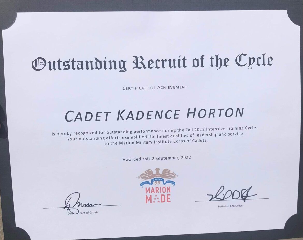 Congratulations to Kadence Horton, of Prattville, who is a member of Charlie Company at Marion Military Institute.
