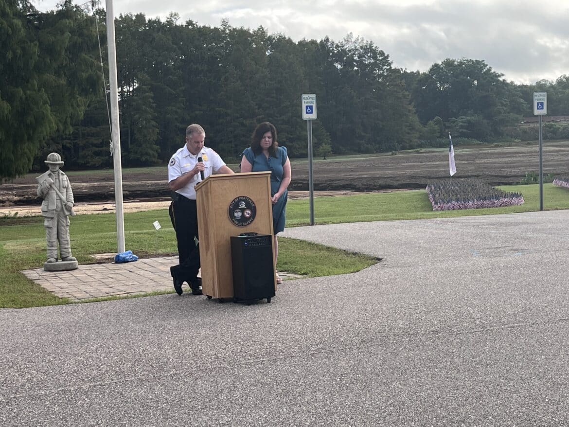 Kervin opened the ceremony by thanking those who worked hard to make the event happen and by thanking our cityโs First Responders. A visual memorial of 2,977 flags were placed to symbolize the lives lost on that fateful day, 21 years ago. City Council President Lora Lee Boone presented the โHonor Flagsโ which were two large American Flags embossed with the names of the heroes and citizens from the 9/11 attacks.