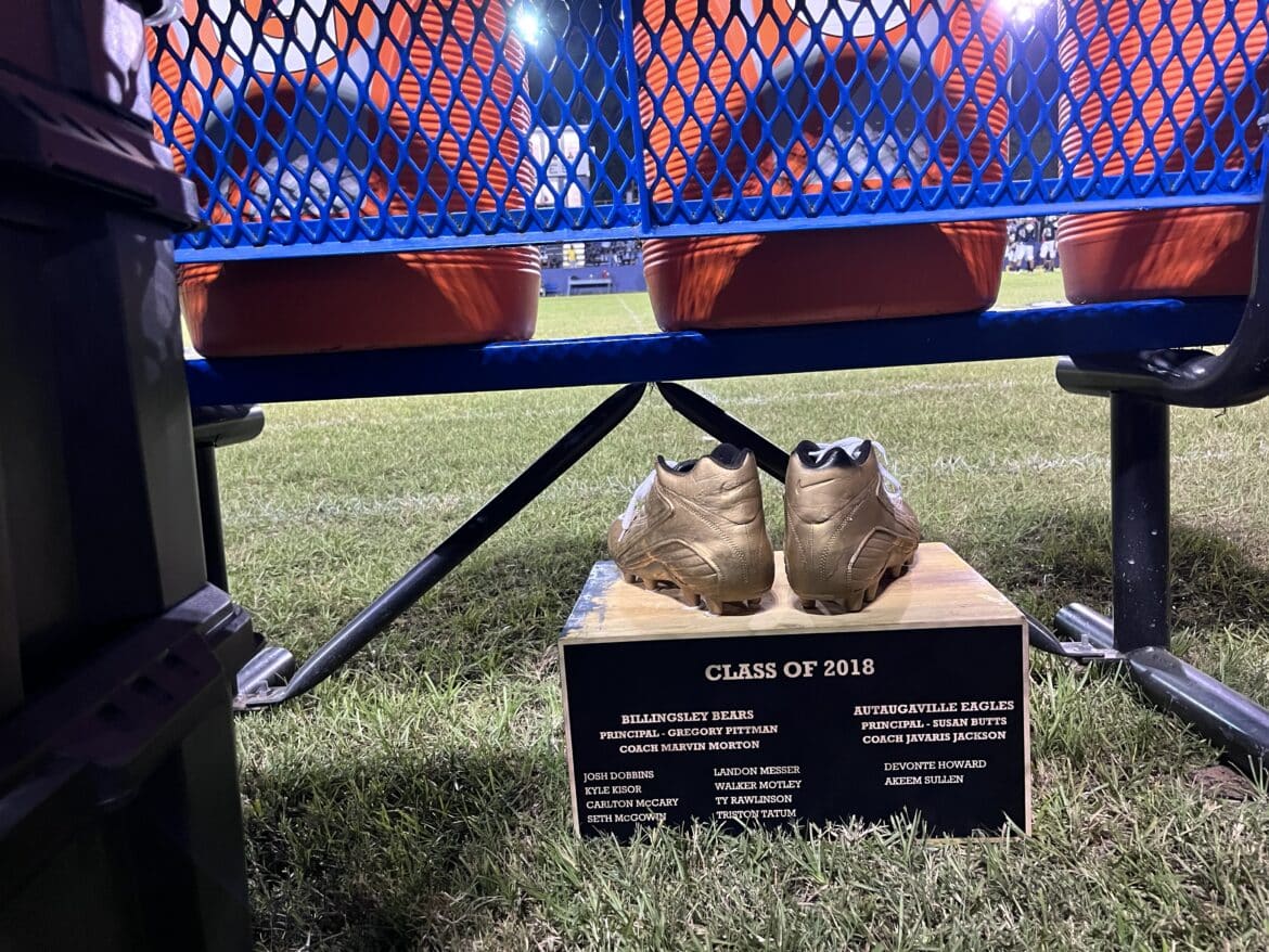 The โGolden Cleatsโ saga was created in 2018 to highlight the longstanding rivalry between Autaugaville and Billingsley football teams. The metallic gold pair of Nike Cleats atop the โGolden Cleatsโ trophy were worn in a 6A Championship Football game by a high school student whose family traces its roots to both the communities of Autaugaville. โThey represent the XMAN commitment to support and reward excellence and achievement in rural communitiesโ Berry said. At the half, Billingsley led Autaugaville 6-3, and then Autaugaville responded with a 46-0 run in the 2nd half.ย