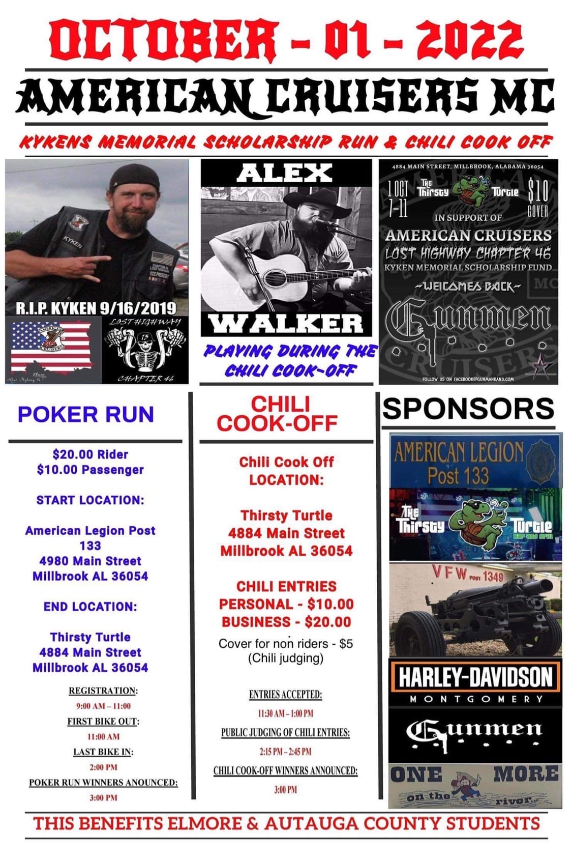Sponsors for this event are the American Legion Post 133, The Thirsty Turtle, VFW 1349, Harley-Davidson of Montgomery and One More on the River.