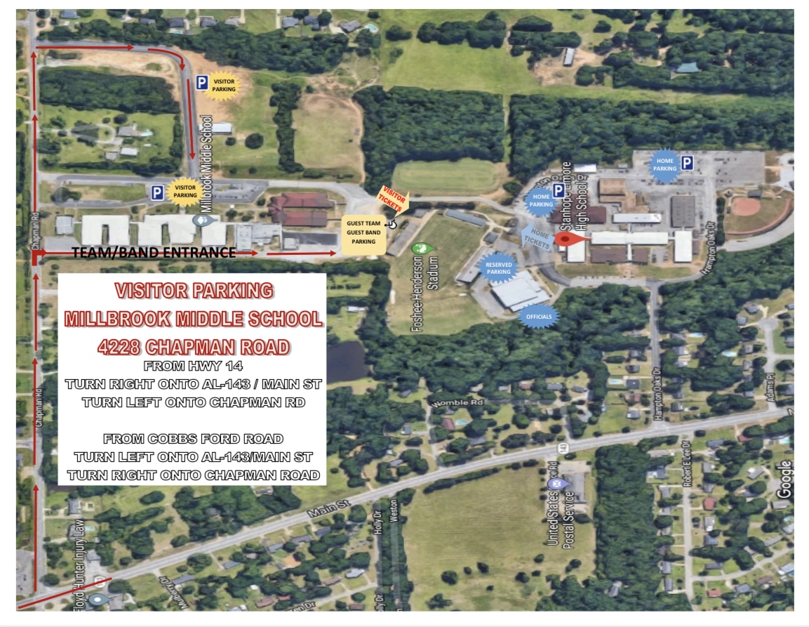 Please know, there is no crossway from the home to the visitor side inside of the stadium. If you are a guest team, please park in the area accessed by Chapman Road. The SEHS Mustangs will play Prattville High School tonight at 7 p.m.