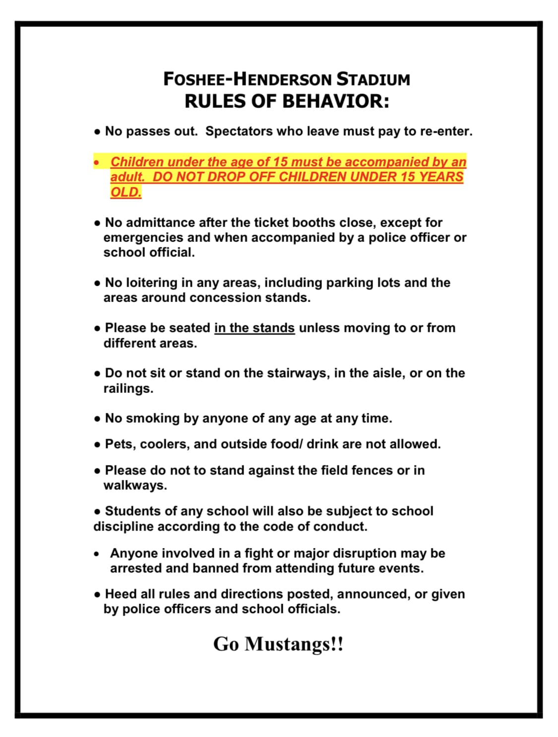 Here are reminders of the rules guests of events at Foshee-Henderson Stadium for Stanhope Elmore High School are required to follow.