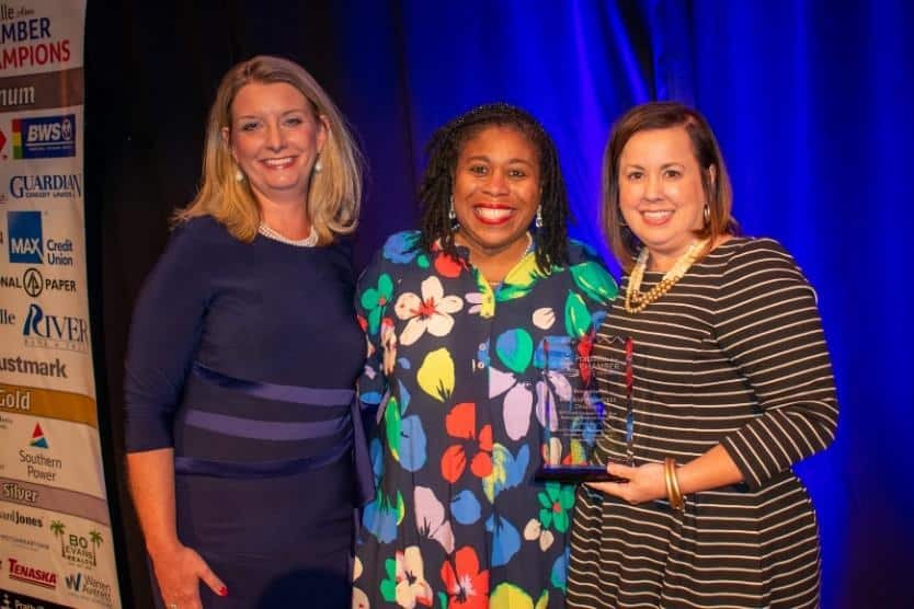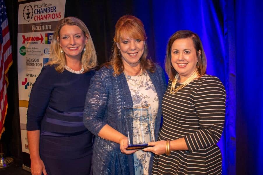 Photos above, from left to right: New Chairman of the Board Catherine Porter and outgoing Chairman Annette Funderburk; Industry of the Year Prattville Baptist Hospital; and Ambassador of the Year Jesse Beavers.