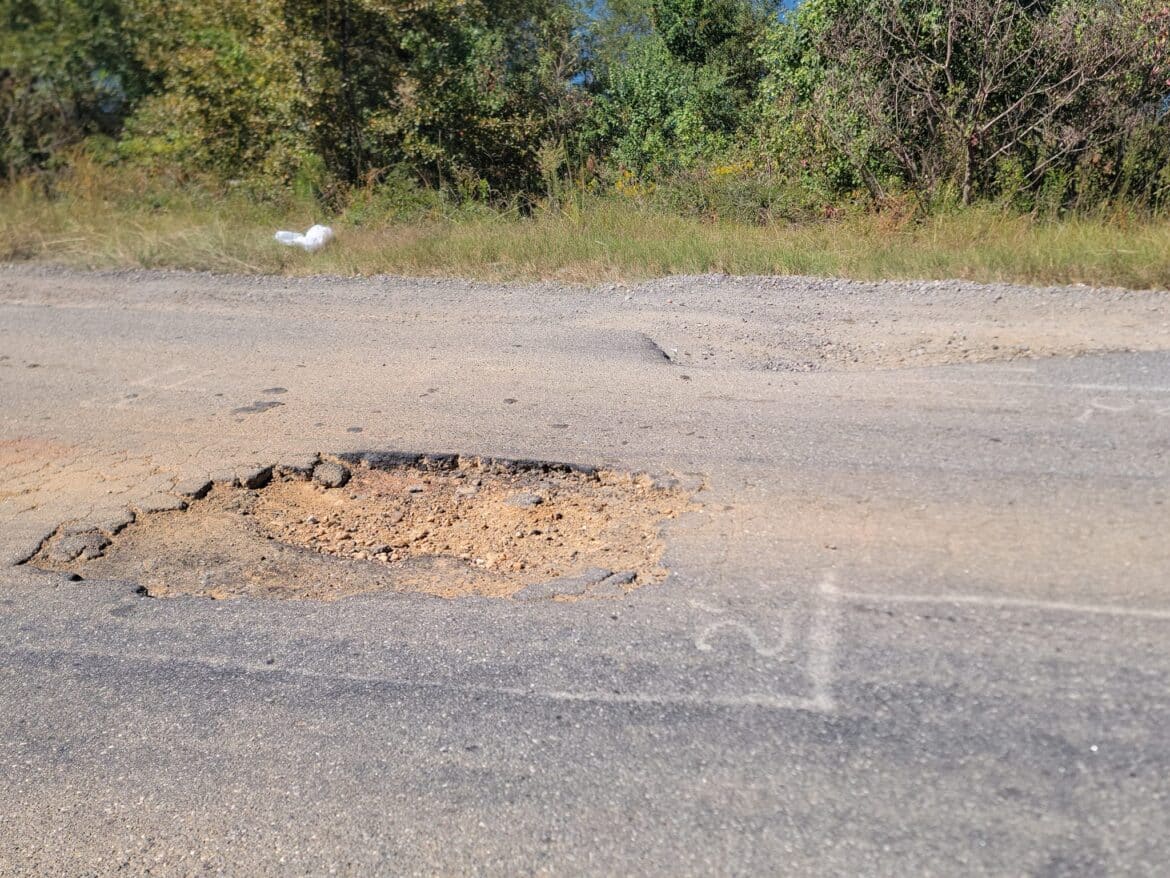 Top Photo: This is one of the large potholes along Marion Spillway Road that travelers say is causing damage and is a safety threat. (Photo credit to Josh Grier)
