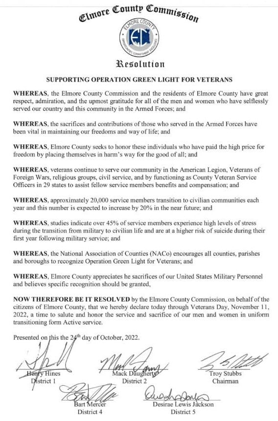 In advance of the upcoming Veterans Day holiday, the Elmore County Commission signed a resolution supporting Operation Green Light, a new national collaborative initiative of the National Association of Counties (NACo) to support military veterans as well as raise awareness about the unique challenges faced by many veterans and the resources that are available at the county, state, and federal level to assist veterans and their families.