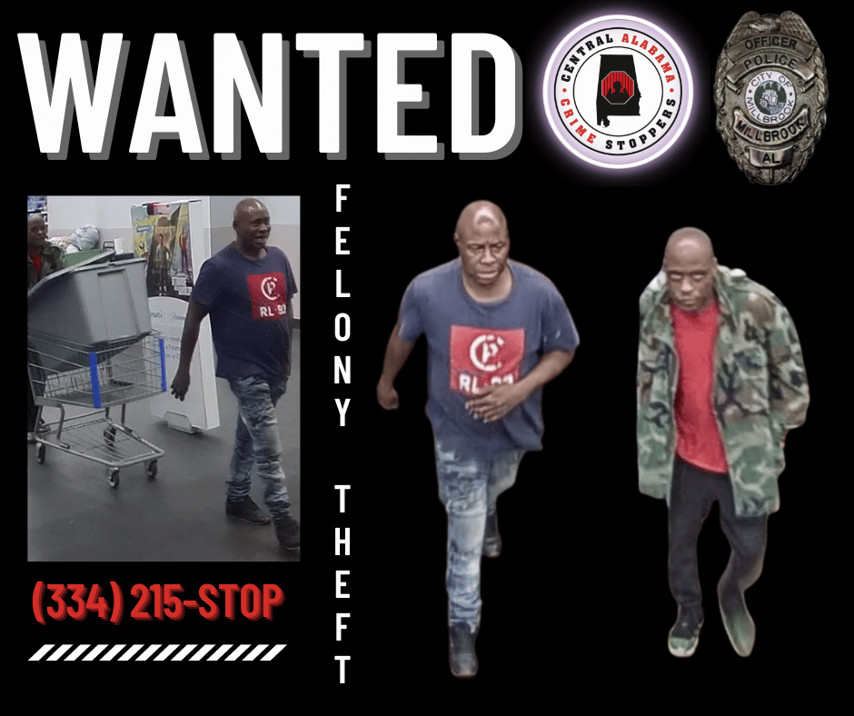 Millbrook Police Investigators released a photo of two unknown subjects wanted for theft. The offense occurred, Wednesday, November 2, 2022, at Walmart, 145 Kelley Boulevard, Millbrook, Alabama. Investigators say the suspects entered the business at this location, took merchandise without paying, and exited the business. There is no other information available currently. The suspects are wanted for, Theft of Property 3rd Degree, a Class D Felony.