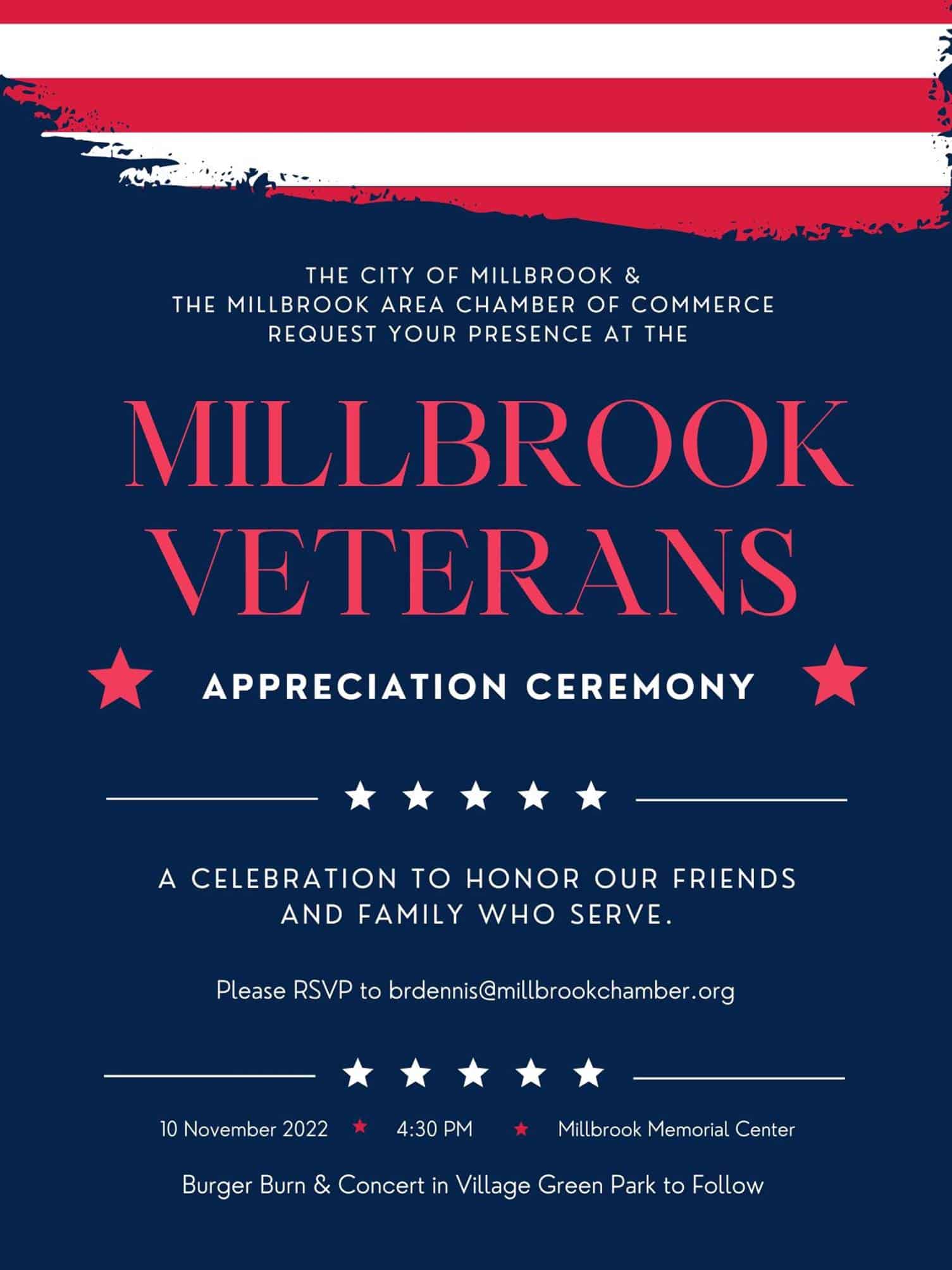The City of Millbrook invites you to a Veterans Appreciation event at the Memorial Center Thursday at 4:30 p.m.! Burger Burn and Concert will be held at Village Green following the appreciation event. The public is welcome and encouraged to attend. We salute our Veterans and thank them for their service.
