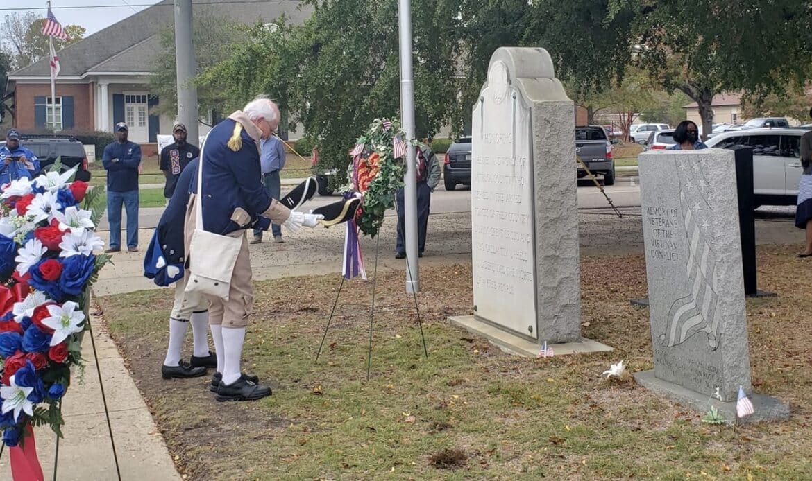 Members of the General John Archer Elmore Chapter of the Sons of the American Revolution placed wreaths in front of memorials on the lawn of the courthouse in remembrance for service, patriotism and dedication of Autauga County residents.