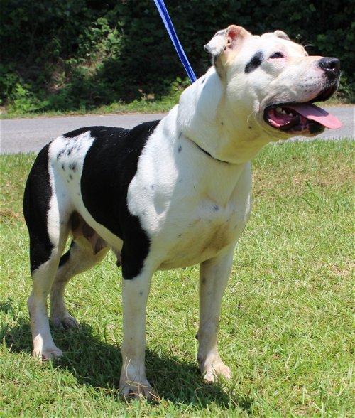 Sadie is a 2-year-old female Pit Bull Terrier who has already been spayed. She is a goodlooking girl who has a white coat with black markings. Sadie weighs 70 pounds so she is a big gal! She is high energy and needs a securely fenced yard where she can safely play.