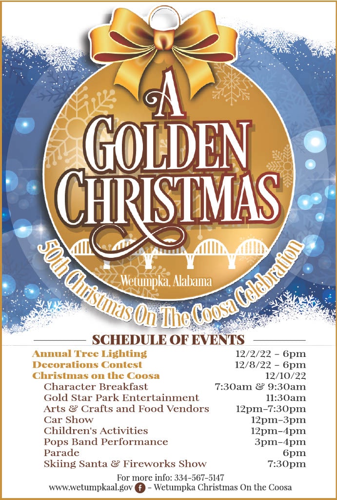 Join us for the 50th Christmas on the Coosa Celebration. We will begin the morning with our annual Character Breakfast of two sessions. The first session is at 7:30 am and the second session at 9:30 am. Gold Star Park Stage Entertainment will begin at 11:30 am and will feature The Leap of Faith Dancers, the Wetumpka Elementary K-2nd grade singers, A Chance the Dance Dancers and Pops Band.