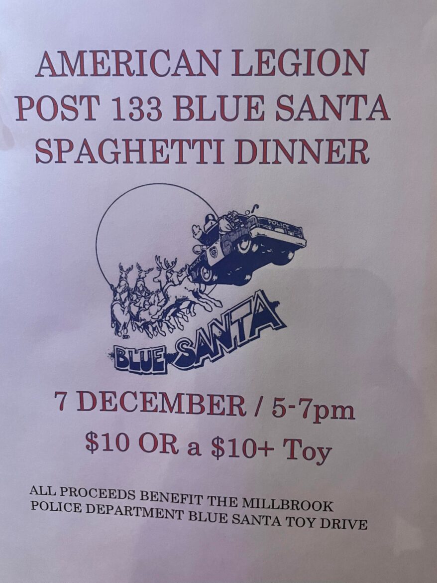 American Legion Post 133 of Millbrook is hosting a Blue Santa Spaghetti Dinner at the Post Dec. 7 to help raise funds, and accept new, unwrapped toys.