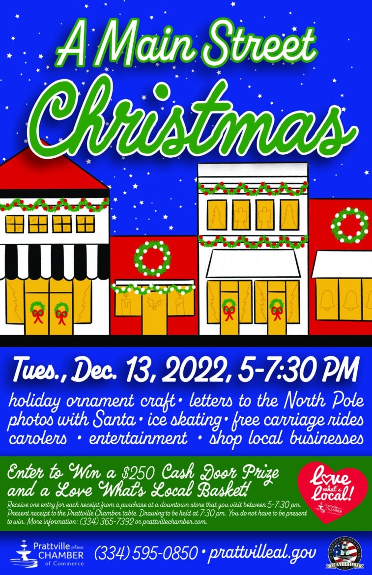 The City of Prattville is decorated in its holiday finest and ready to greet you and your family and friends at the 7th Annual A Main Street Christmas event on Tuesday, December 13, in the historic Downtown District from 5:00-7:30 p.m. We are excited to partner with the Prattville Area Chamber of Commerce and the merchants of downtown again this year for this fun, family-friendly event.
