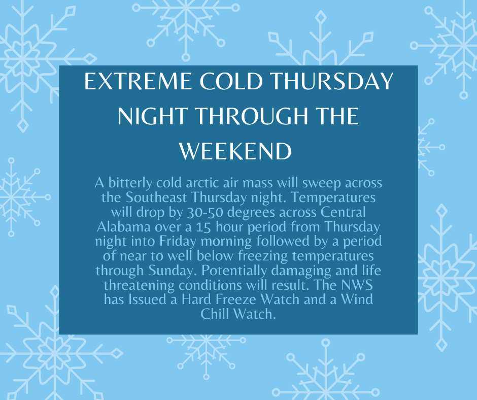 A bitterly cold arctic air mass will sweep across the Southeast Thursday night. Temperatures will drop by 30-50 degrees across Central Alabama over a 15-hour period from Thursday night into Friday morning followed by a period of near to well below freezing temperatures through Sunday. Potentially damaging and life-threatening conditions will result. The NWS has Issued a Hard Freeze Watch and a Wind Chill Watch.