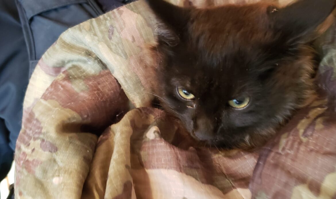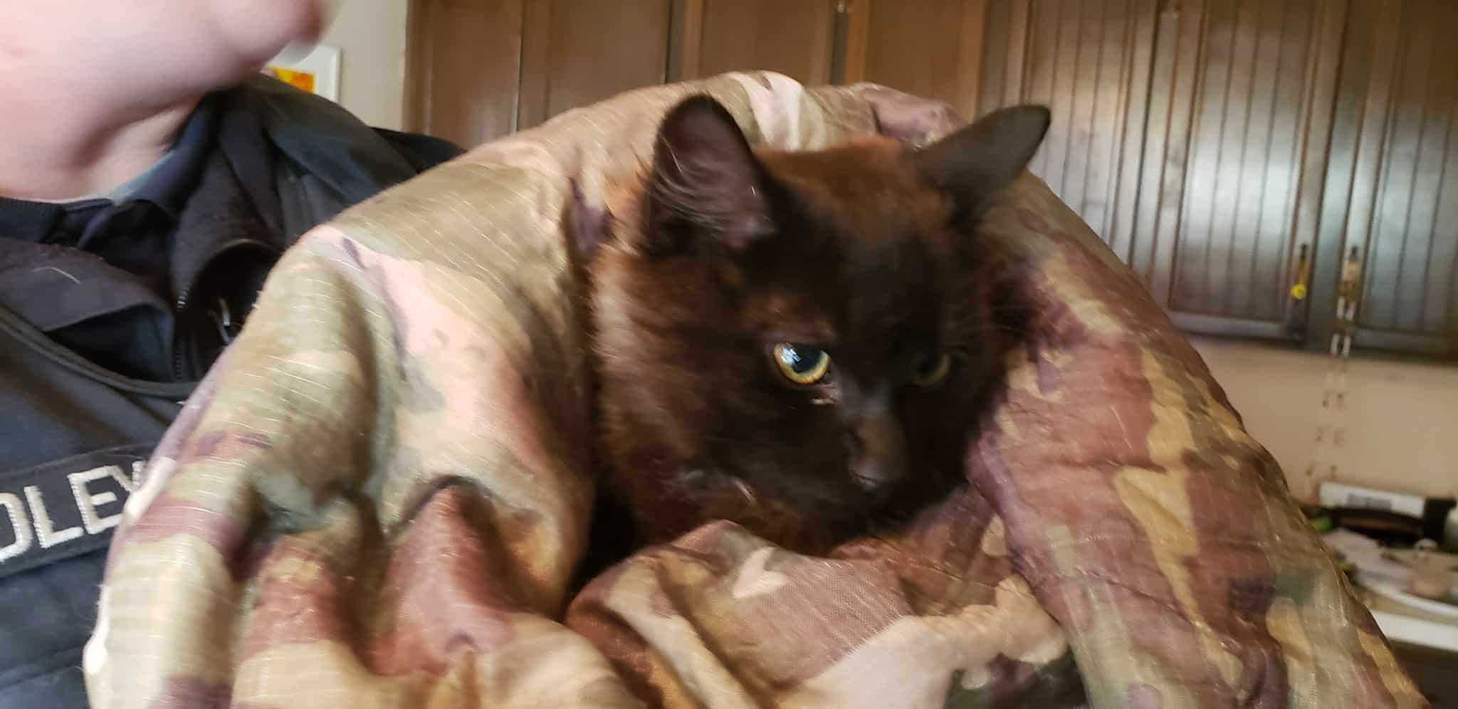 Officer Spradley wrapped her in a poncho liner and brought her to our house for my veterinarian husband to check out. She was warmed up and loved, as my husband Mel completed the thawing out of her paws. She is meowing, and safe at our house.