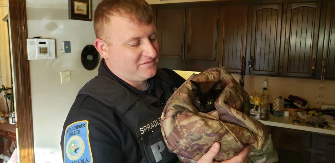 Officer Spradley wrapped her in a poncho liner and brought her to our house for my veterinarian husband to check out. She was warmed up and loved, as my husband Mel completed the thawing out of her paws. She is meowing, and safe at our house.