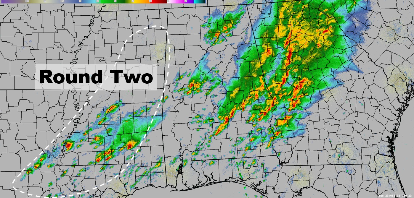 From the National Weather Service at Birmingham: “We’ve already had several likely tornadoes today in Central Alabama. Round one of storms is in the process of shifting into Georgia with the tail end of activity still affecting areas toward I-85. Round two is kicking off back in Mississippi. This is our next batch of storms that will pose a risk of severe weather tonight into early Wednesday morning, including: tornadoes, damaging winds, and quarter size hail. **Make sure you check on the latest weather conditions before heading to bed and have a way to be woken up if a warning is issued for your area (weather radio, reliable weather app., Wireless Emergency Alert on your smartphone/WEA).**”