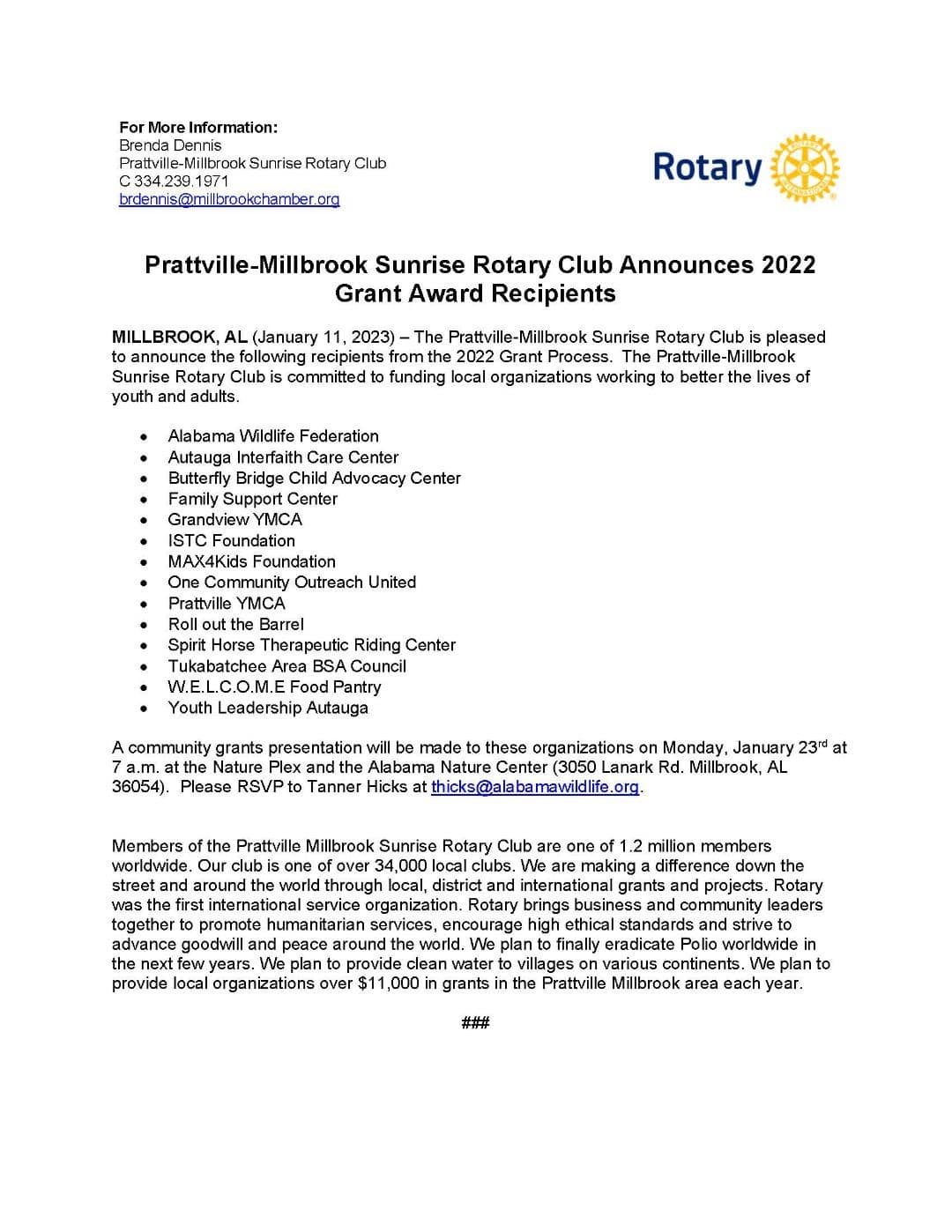Prattville-Millbrook Sunrise Rotary Club Announces 2022 Grant Award Recipients