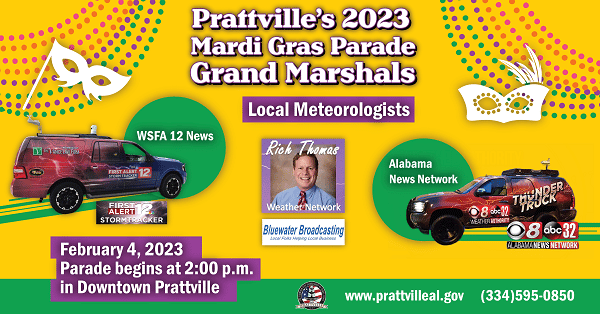 Prattville city officials recently announced the Grand Marshals for the upcoming Mardi Gras Parade. This year, Prattville will honor local meteorologists from WSFA, Alabama News Network, and the Rich Thomas Weather Network on Bluewater Broadcasting on Saturday, Feb. 4.