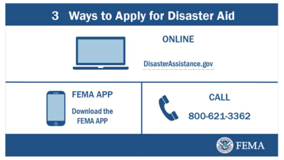 There are three ways to apply. Visit DisasterAssistance.gov, download the FEMA App for mobile devices, or all toll-free 800-621-3362. The helpline is available from 6 a.m. to 10 p.m.