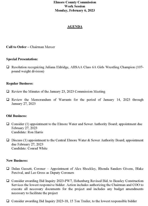 The Elmore County Commission meets on the 2nd Floor of the Historic Elmore County Courthouse, downtown Wetumpka. Work Session starts at 5:00 p.m. and Commission meeting soon after, normally about 6:00 p.m.