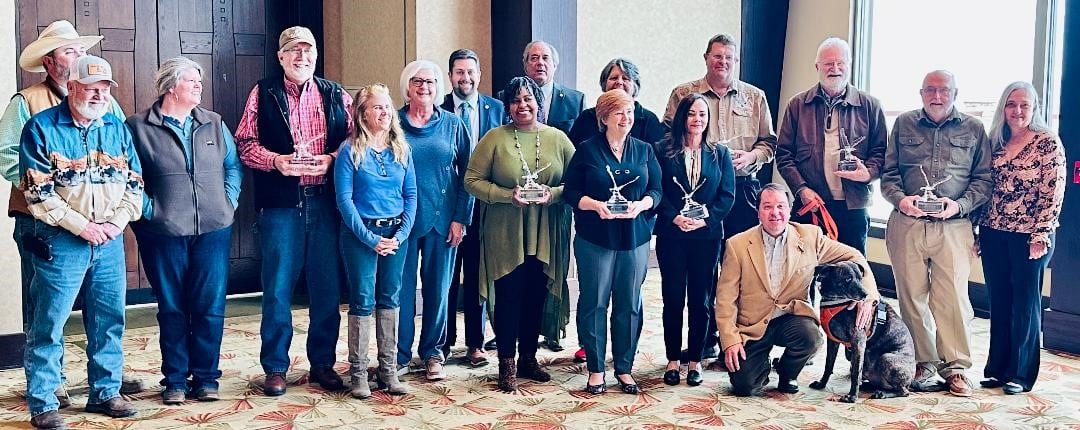 Top Photo: Here are Eagle Award winners, from left to right: Chad Jones, president of McClellan Chapter Member of the Back Country Horsemen of Alabama; Steve Lathem, president of Wind Creek Chapter of the Back Country Horsemen of Alabama; Jaime Ruff, president of West Alabama Chapter of the Back Country Horsemen of Alabama; Mike Bagwell, chairman of the Back Country Horsemen of Alabama; Heather Jones, president of Central Chapter the Back Country Horsemen of Alabama; Pam Horton, president of Warrior Mountain Chapter of the Back Country Horsemen of Alabama; state Rep. Wes Kitchens; Tamika Eatmon, of AmeriCorps NCCC; state Sen. Steve Livingston; Verna Gates; Barbara Greenlee; Toni Bruner; Curt Cearley; State Parks Director Greg Lein, kneeling with dog; Mitch Emmons; and Dianne and Mason Johnson.