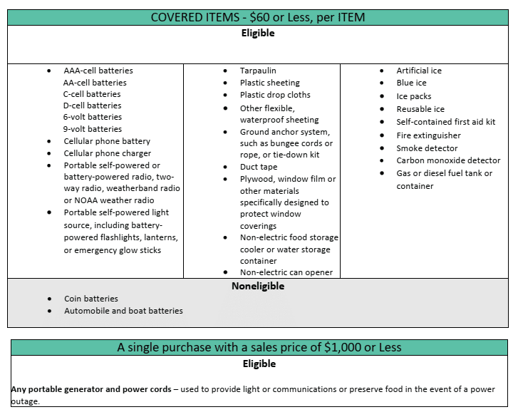 Each eligible item must be $60 or less. Eligible items include AAA-cell batteries, AA-cell batteries, C-cell batteries, D-cell batteries, 6-volt batteries, 9-volt batteries, cellular phone battery, cellular phone charger, portable self-powered or battery-powered radio, two-way radio, weather band radio, or NOAA weather radio, portable self-powered light source, including battery powered flashlights, lanterns, or emergency glow sticks, tarpaulin, plastic sheeting, plastic drop cloths, other flexible, waterproof sheeting, ground anchor system such as bungee cords or rope, or tie-down kit, duct tape, plywood, window film or other materials specifically designed to protect window coverings, non-electric food storage cooler or water storage container, non-electric can opener, artificial ice, blue ice, ice packs, reusable ice, self-contained first aid kit, fire extinguisher, smoke detector, carbon monoxide detector, gas or diesel fuel tank or container.