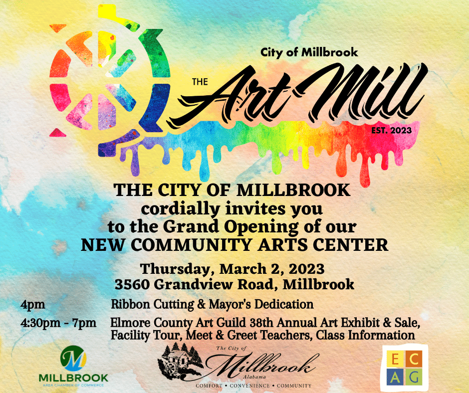 Along with the Millbrook Area Chamber of Commerce, the City will have the ribbon cutting and Mayor’s dedication at 4 p.m. Following that will be tours of the facility, a Teacher Meet and Greet, and upcoming class information. An additional opportunity is the chance to see wonderful artwork on display at the Art Mill, featuring artists with the Elmore County Art Guild, including a sale of their work from 4:30 to 7 p.m.