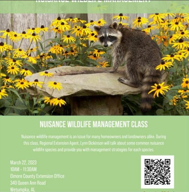 A Nuisance Wildlife Management informational class will be held March 22. 2023 from 10 am to 11:30 am at Elmore County Extension Office. The address is 340 Queen Ann Road Wetumpka, AL 36092