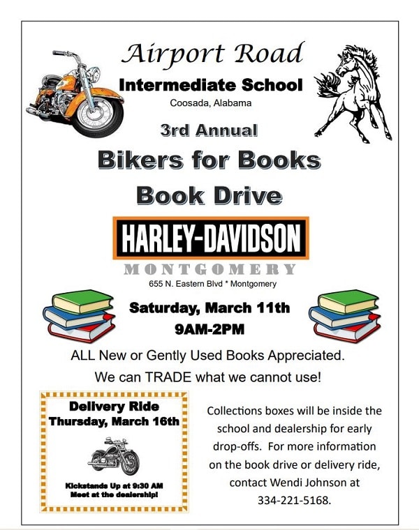 Collection boxes will be inside the Airport Road Intermediate School in Coosada. They are also located at the Harley-Davidson Montgomery dealership for early drop-offs. For more information on the book drive or delivery ride, contact Wendi Johnson at 334-221-5168.