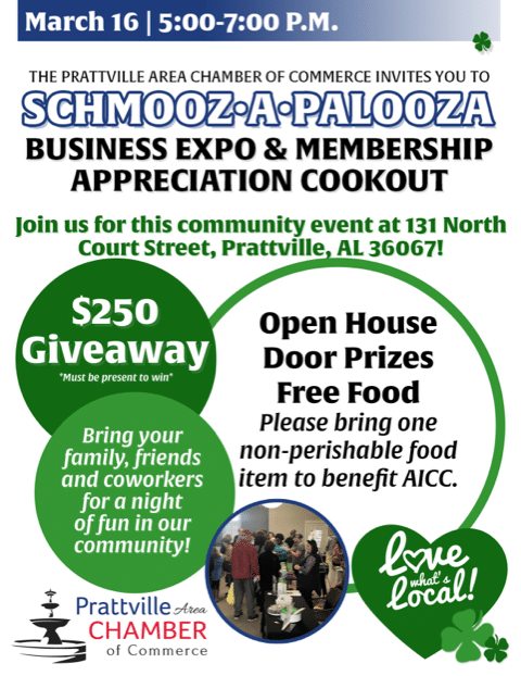 PRATTVILLE, Ala. – The Prattville Area Chamber of Commerce will host Schmooz-A-Palooza this Thursday, March 16, from 5:00-7:00 P.M. at 131 North Court Street in Historic Downtown Prattville. This free event will feature a business expo, membership appreciation cookout and open house. Door prizes will be awarded throughout the event and the night will end with a $250 giveaway.