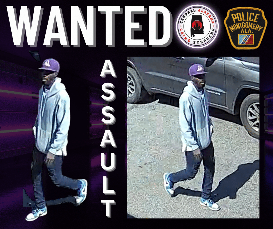 Montgomery Police released photos of an unknown suspect wanted for the assault. The pictured suspect was seen on video wearing a purple baseball cap, hooded sweatshirt, dark-colored pants, and tennis shoes.