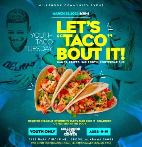 “Let’s ‘TACO’ ‘Bout It” was a roaring success on 21 March at the Millbrook Civic Center! Over 100 youth attended this fun and informative event that including dancing, a 360 Booth, games and prizes. City Councilwoman Jacquelyn Thomas (Ward 1) gathered community members: Bryishun (BJ) Pernell, Izera Dumas and Marjorie Lynn Bowden together to present this event to show our youth how much they matter to us.