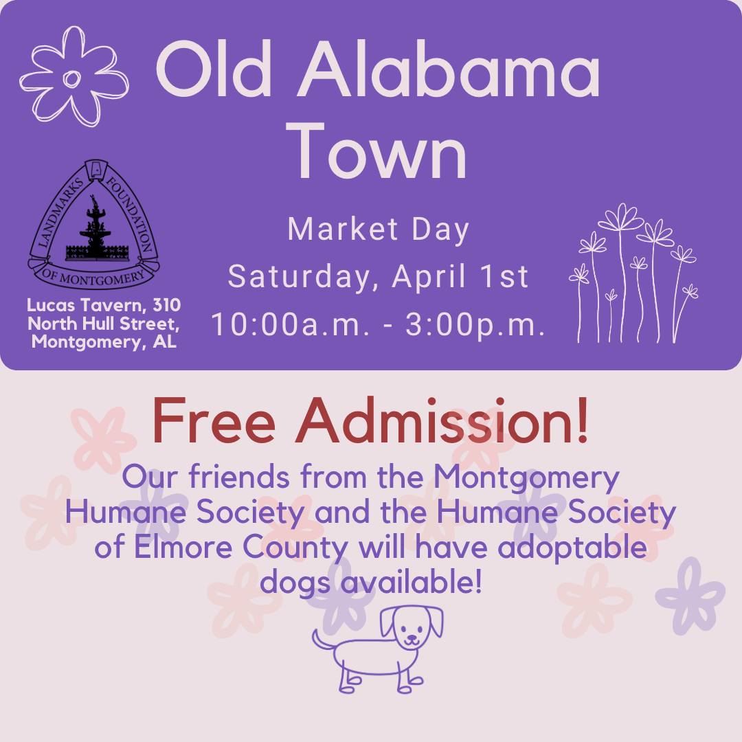 Hope for a great turnout this coming Saturday, 1 April, 9 am – 3 pm at Old Alabama Town, 310 North Hull Street, Montgomery. Both our Shelter and the Montgomery Humane Society will be joining in the “Market Day” fun with some of our great pups looking for homes. So,mark your calendar to visit Old Alabama Town as there will also be a large number of Vendors looking forward to your support. If you have never visited this great historical site then this Saturday will be the perfect day!