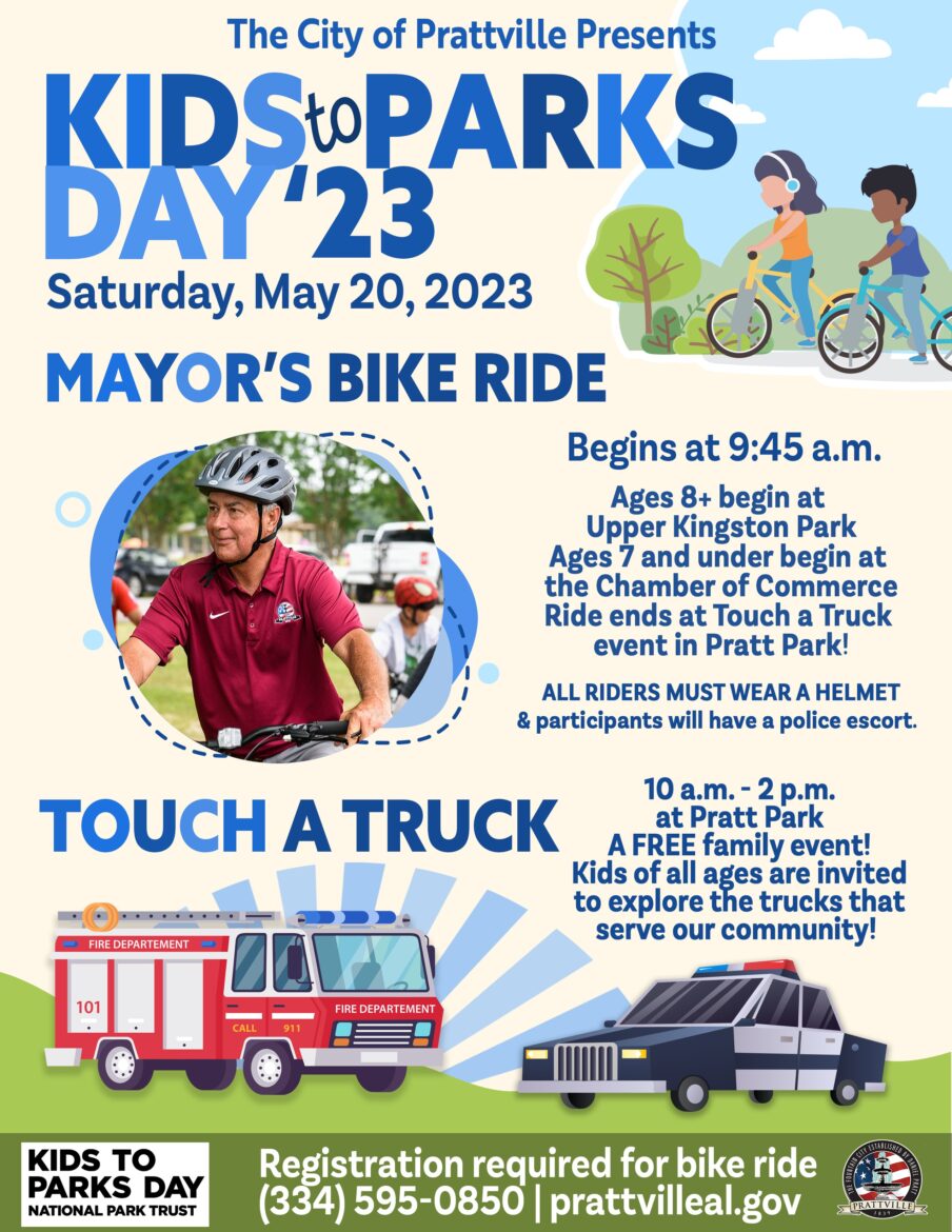 National Kids to Park Day is Saturday, May 20, and the City of Prattville is planning a great fun-filled day to enjoy the outdoors! To kick off the celebration, kids and their families can join Mayor Bill Gillespie, Jr., for the annual Mayor’s Bike Ride at Upper Kingston Park and ride to the Touch A Truck event at Pratt Park.