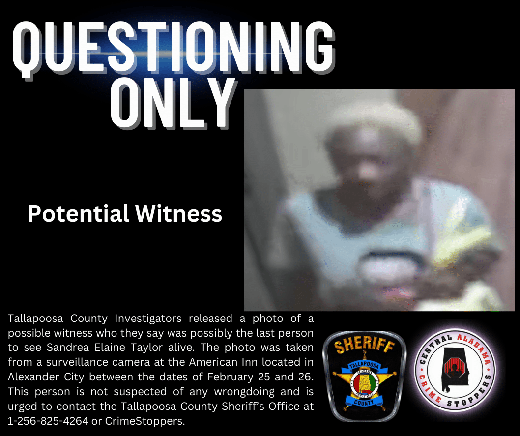 Tallapoosa County Investigators released a photo of a possible witness who they say was possibly the last person to see Sandrea Elaine Taylor alive. The photo was taken from a surveillance camera at the American Inn located in Alexander City between the dates of February 25 and 26. This person is not suspected of any wrongdoing and is urged to contact the Tallapoosa County Sheriff’s Office at 1-256-825-4264 or CrimeStoppers.