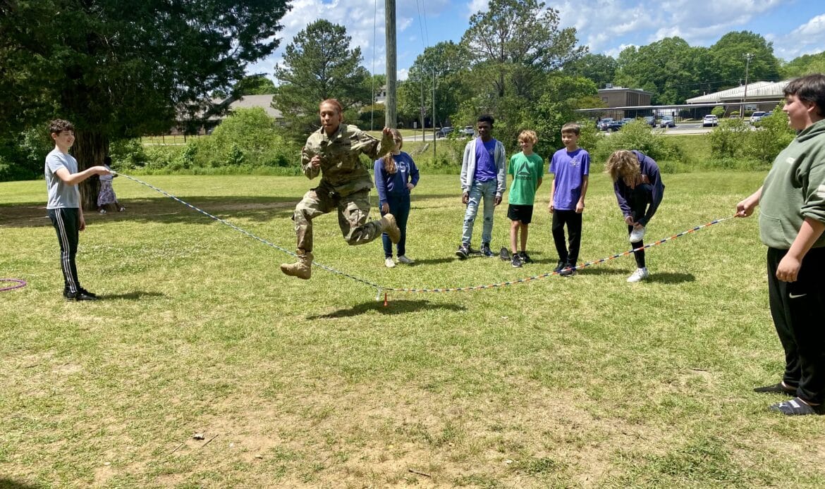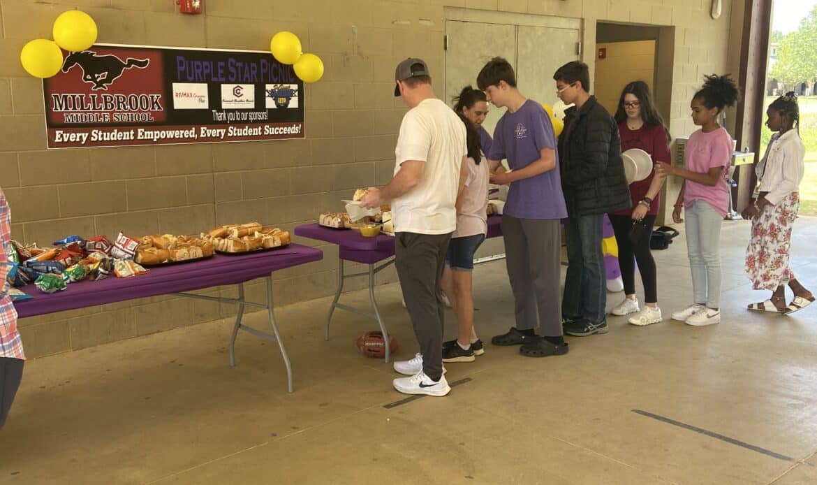 On Friday Millbrook Middle School hosted their inaugural Purple Star Picnic event for their military students and their families. Over 60 guests were in attendance. Millbrook Middle was recently recognized as one of the Purple Star schools. The picnic included sandwiches, chips, cookies, and drinks. Special guests included Superintendent Richard Dennis, and School liaison program managers Katheryn Ganster and Robert Richert; Rachel Surles, Community Coordinator from the Military Child Education Coalition; Christine Flynn, Military and Family Life Counselor; Ayena Jackson, Middle School Director; and Shay Jackson, Senior Coordinator of Secondary Curriculum Military Liaison for ECPS. Families had lunch, played games on the law with their children and spent time visiting.