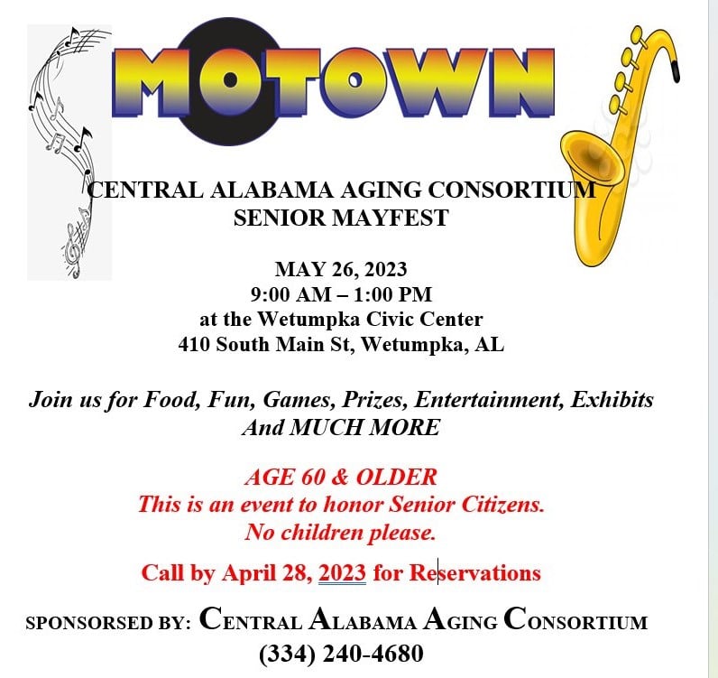Central Alabama Aging Consortium invites you to our biggest in-person event of the year, May Fest, in honor of Older Americans Act of 1965.  Around 400 senior citizens will gather at Wetumpka Civic Center to remember the oldies of Motown!  The seniors have been invited from 18 senior centers across Autauga, Elmore, and Montgomery counties.  This is an invitation only event that we think will give you plenty of visuals, audio opportunities, pictures, and interviews with some of our region’s most engaged seniors.