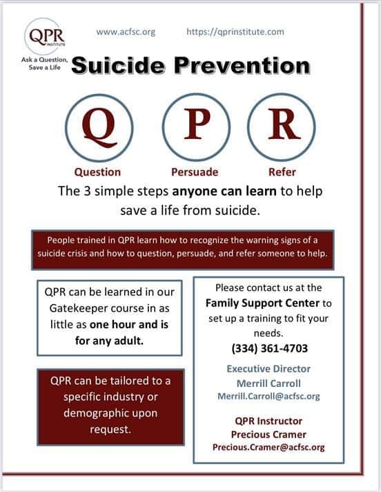 The event and details are on Eventbrite https://www.eventbrite.com/e/qpr-suicide-prevention-with-the-family-support-center-tickets-625679272547