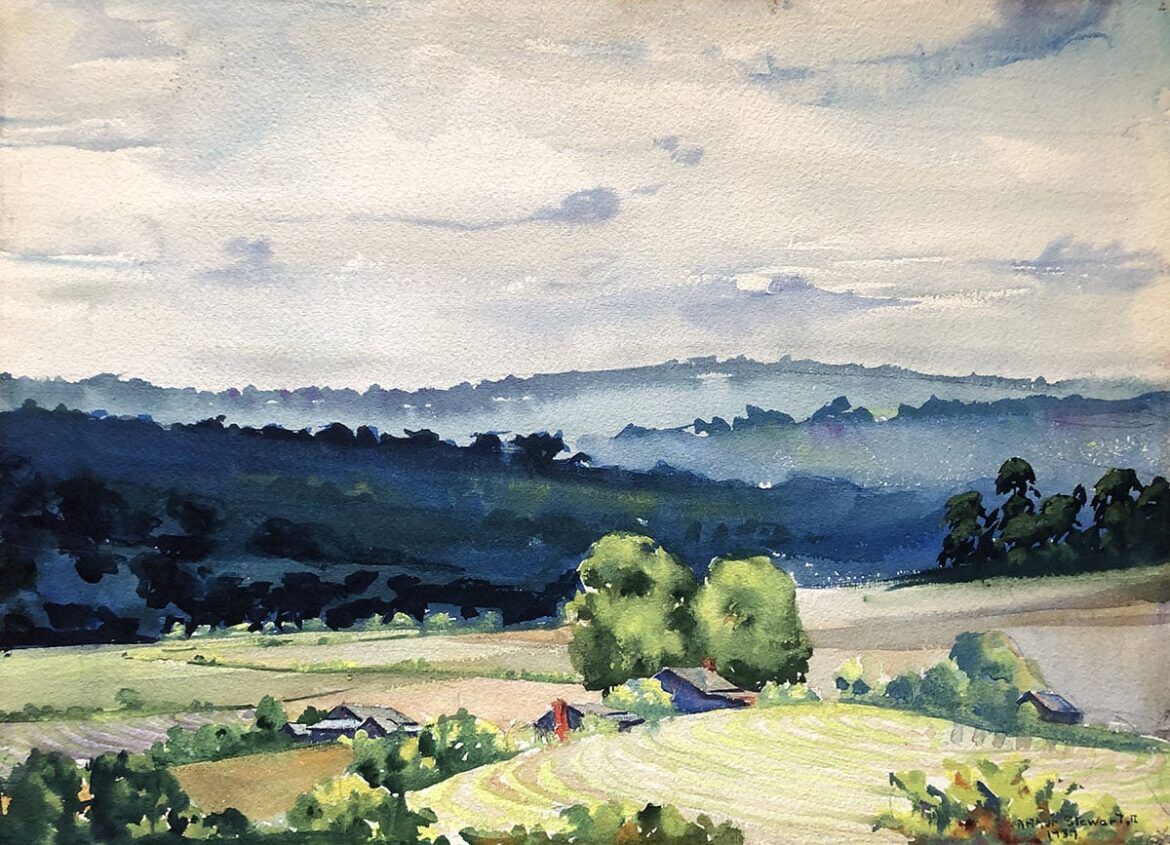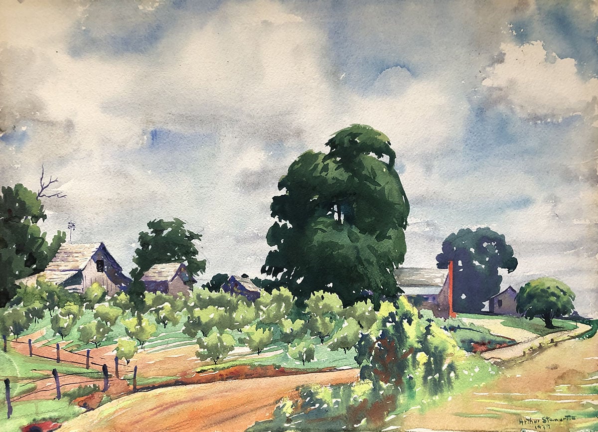 We are pleased to announce that two Arthur Walter Stewart watercolor landscapes were recently donated to the Dixie Art Colony Foundation. The pair of paintings came to us from the Denver, Colorado, area. They were donated by the granddaughter of the person that acquired them from Stewart. The donor believes the paintings were purchased from Stewart while he was in France on a painting vacation. However, the paintings dated 1939 appear to be of rural Alabama. Looking closely, you can see “Martin Gourds” hanging on a pole behind one of the barns. The paintings are stylistically reminiscent of the work of Stewart’s mentor John Kelly Fitzpatrick and the work we at the DAC Foundation refer to as “The Colony Style.”