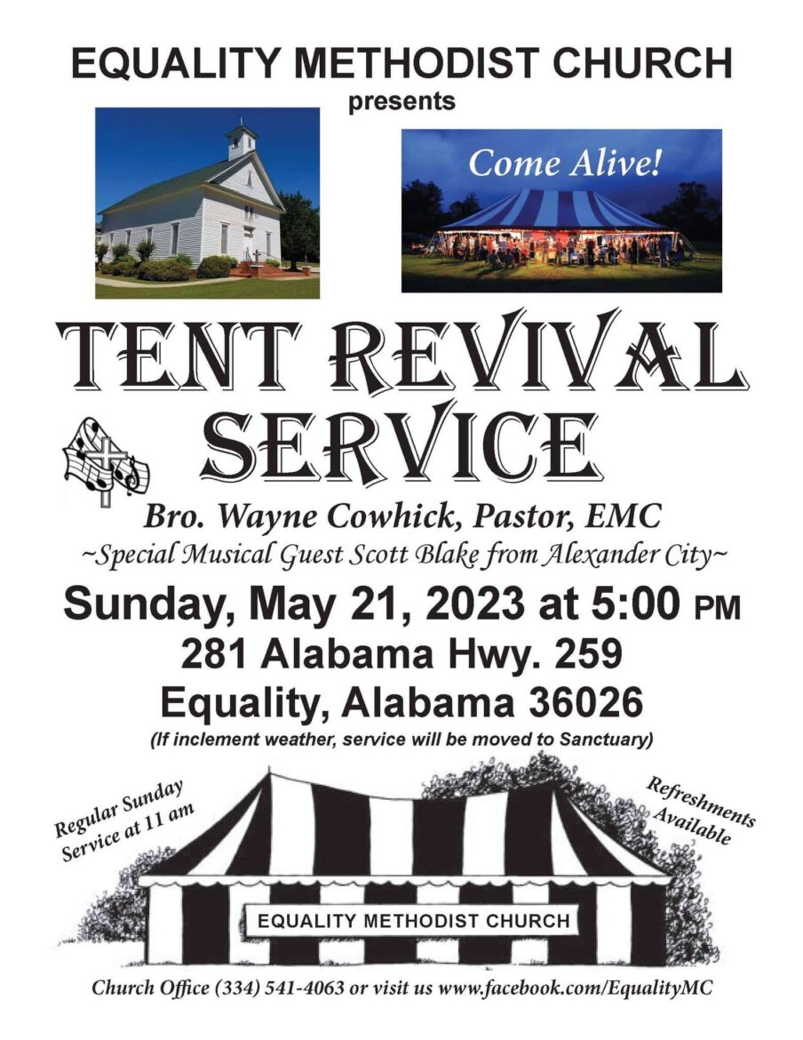 Equality Methodist Church will hold a Tent Revival Service Sunday, May 21, at 5 p.m. The regular Sunday Service will be held at 11 a.m.