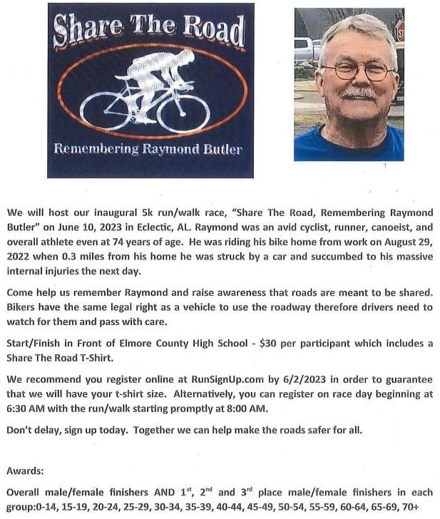 An inaugural 5K run/walk race, “Share The Road, Remembering Raymond Butler” will be held June 10 in Eclectic!