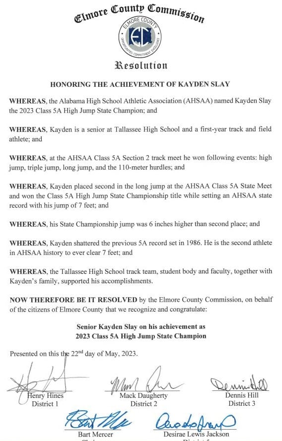 Monday, the Elmore County Commission passed three resolutions recognizing the State Championship for Wetumpka High School Softball, Holtville High School Baseball, and THS senior Kayden Slay – High Jump State Champion with State Record high jump.