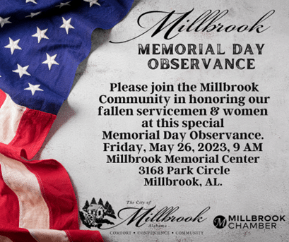 MILLBROOK, Alabama – The City of Millbrook will host a Memorial Day ceremony on Friday, May 26, 2023, at the Memorial Center in Millbrook (3170 Park Circle). The ceremony will start at 9 a.m.