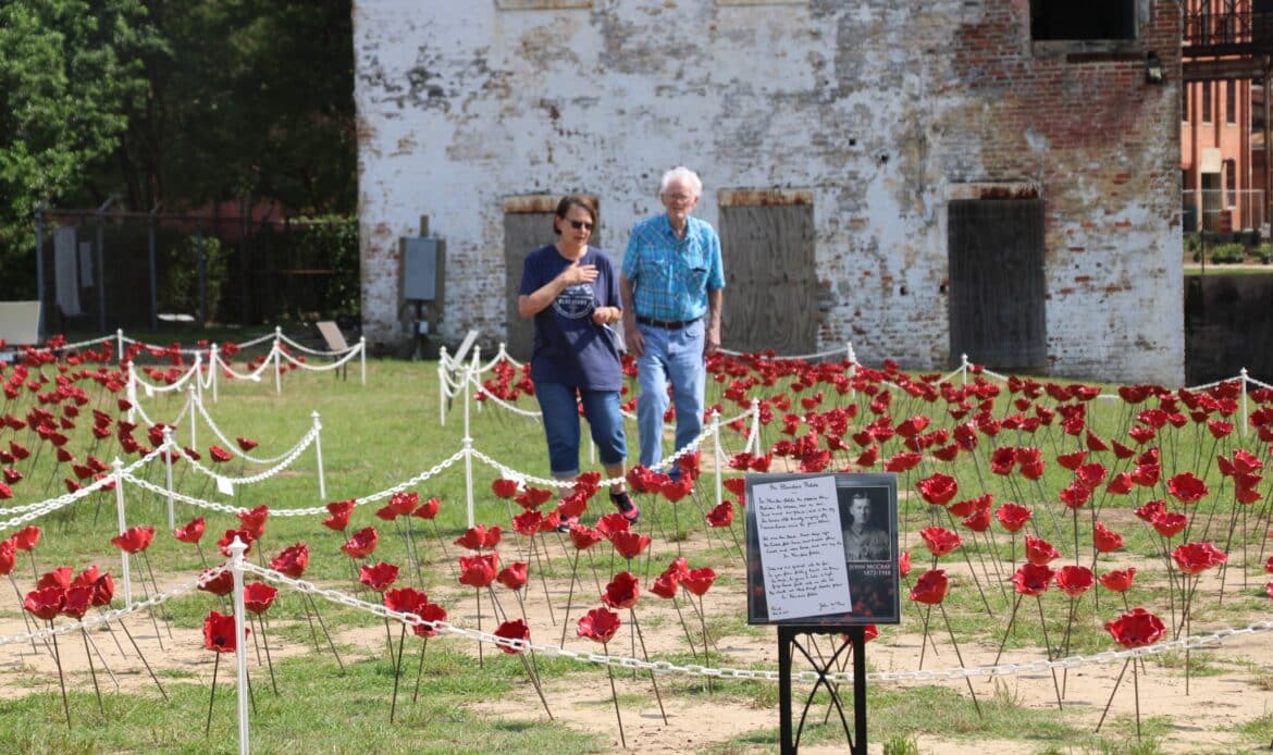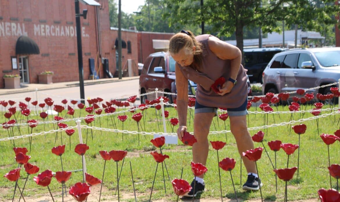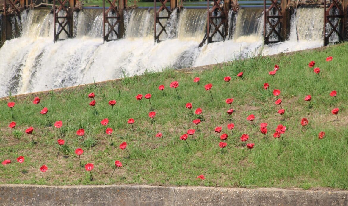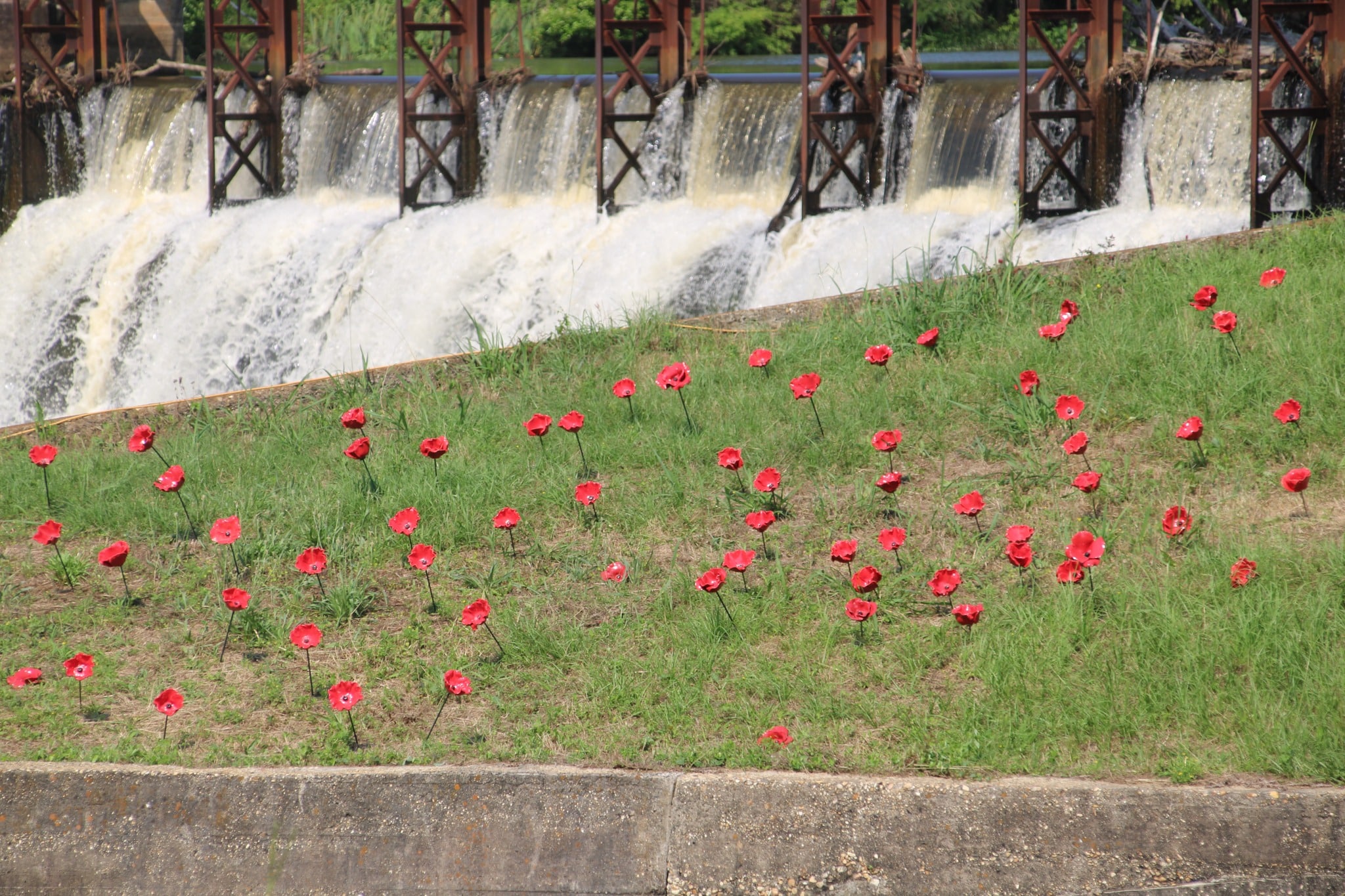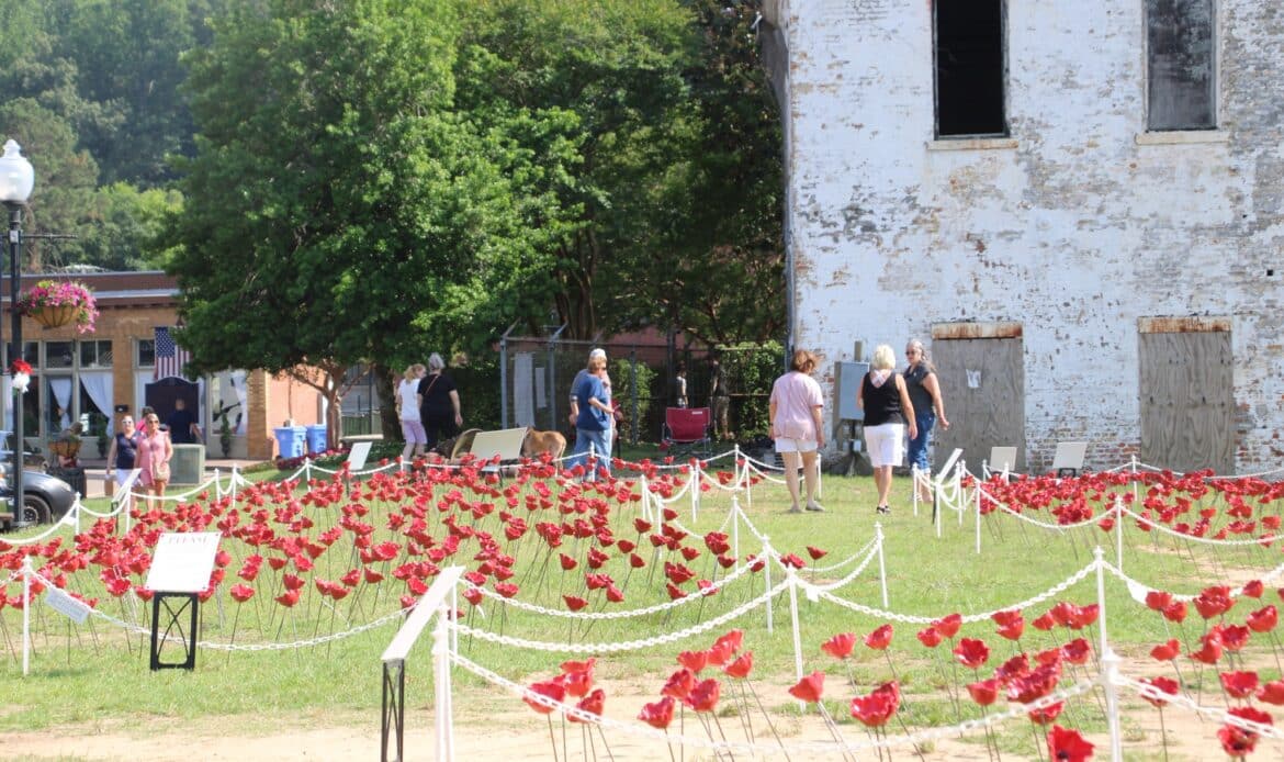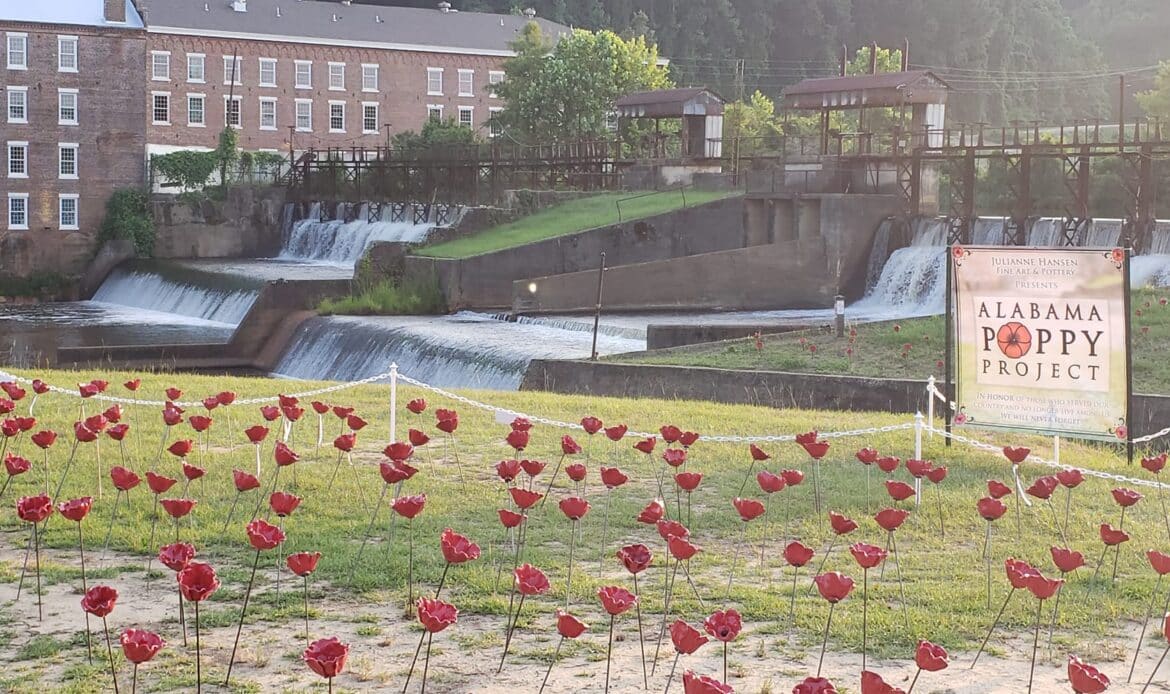 Fields of ceramic, handmade poppies are planted next to Autauga Creek and historic buildings. Each represents the life of a service man or woman who died in service, or has since died.