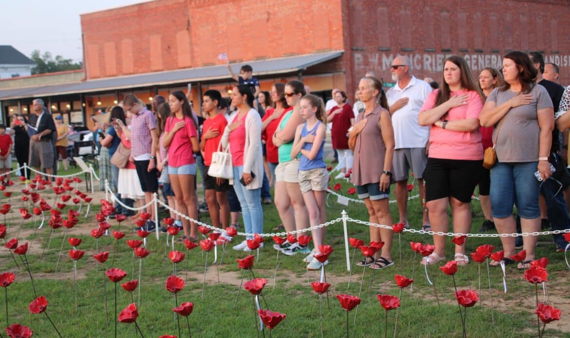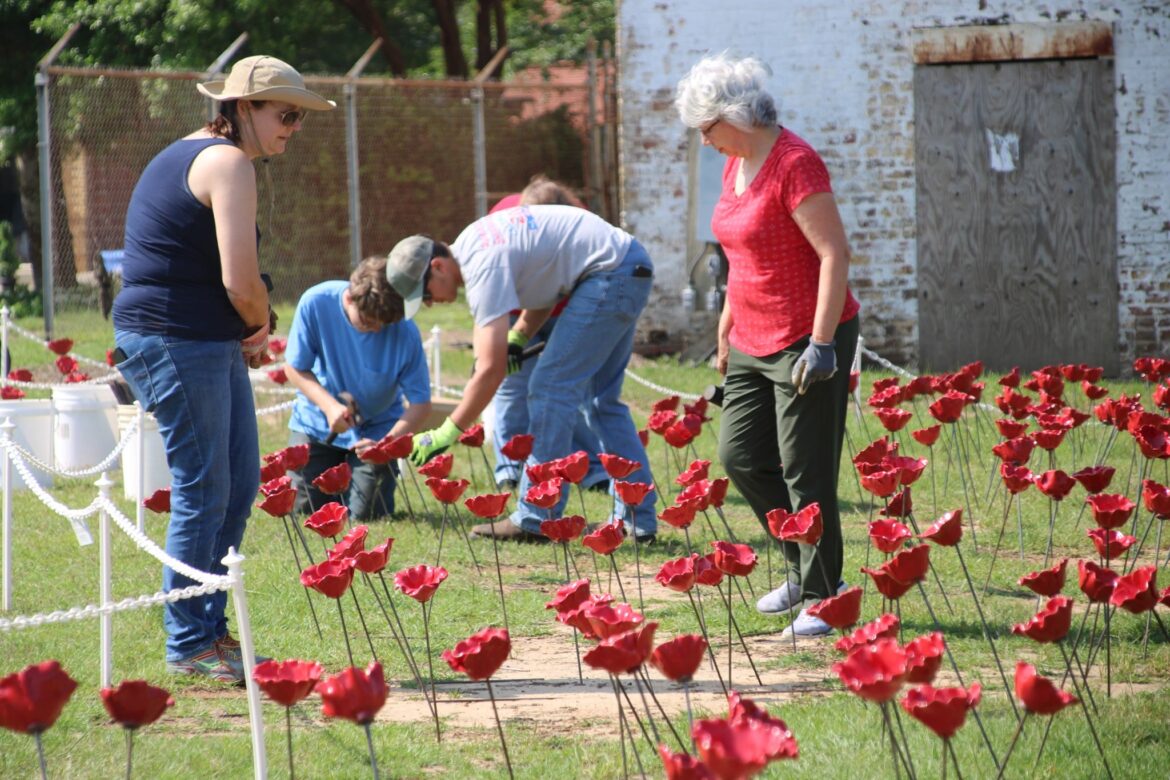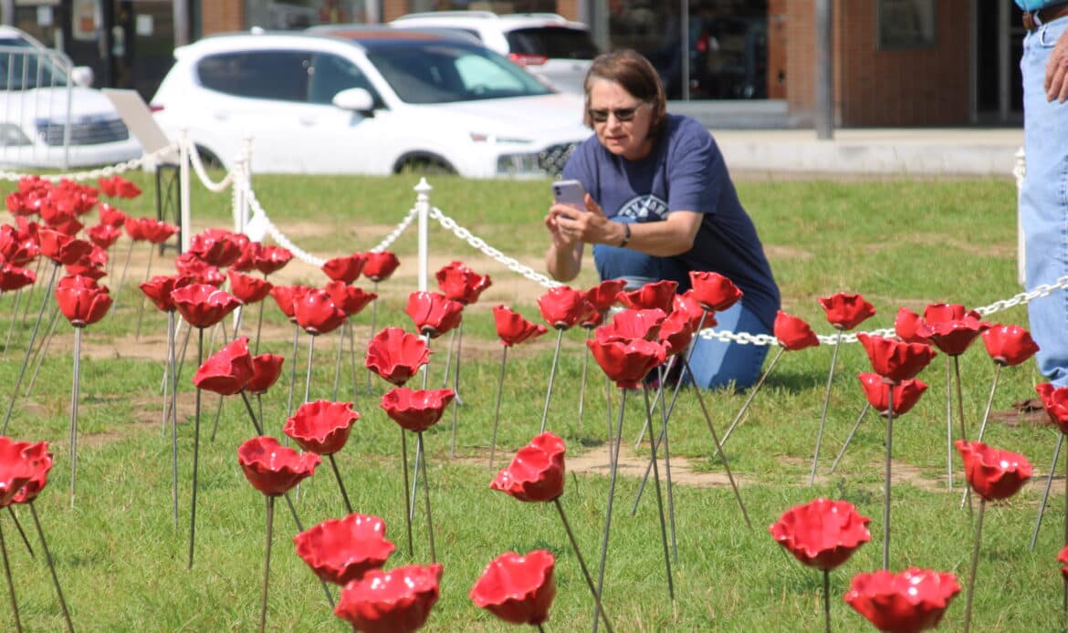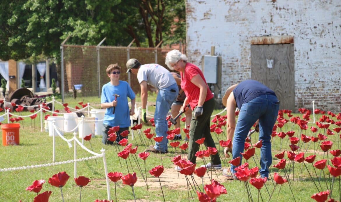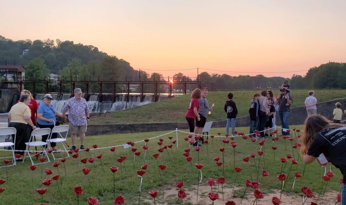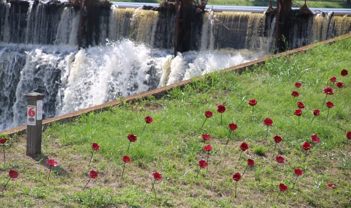 Fields of ceramic, handmade poppies are planted next to Autauga Creek and historic buildings. Each represents the life of a service man or woman who died in service, or has since died.