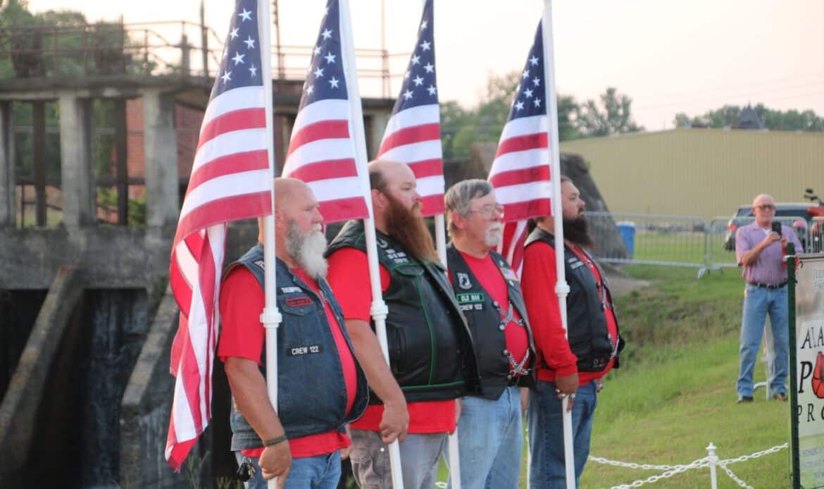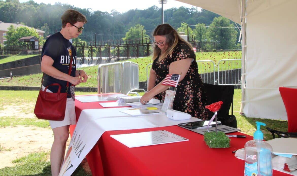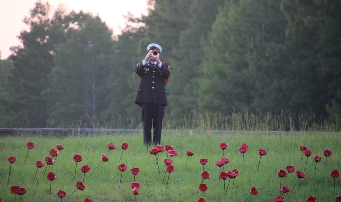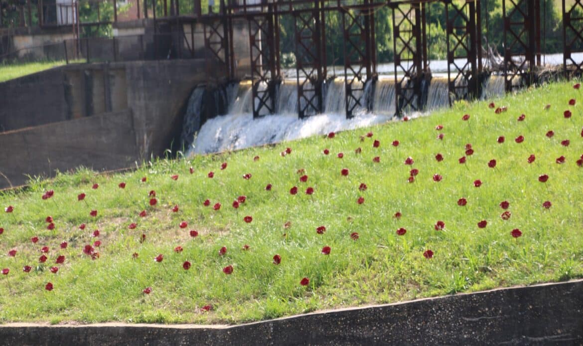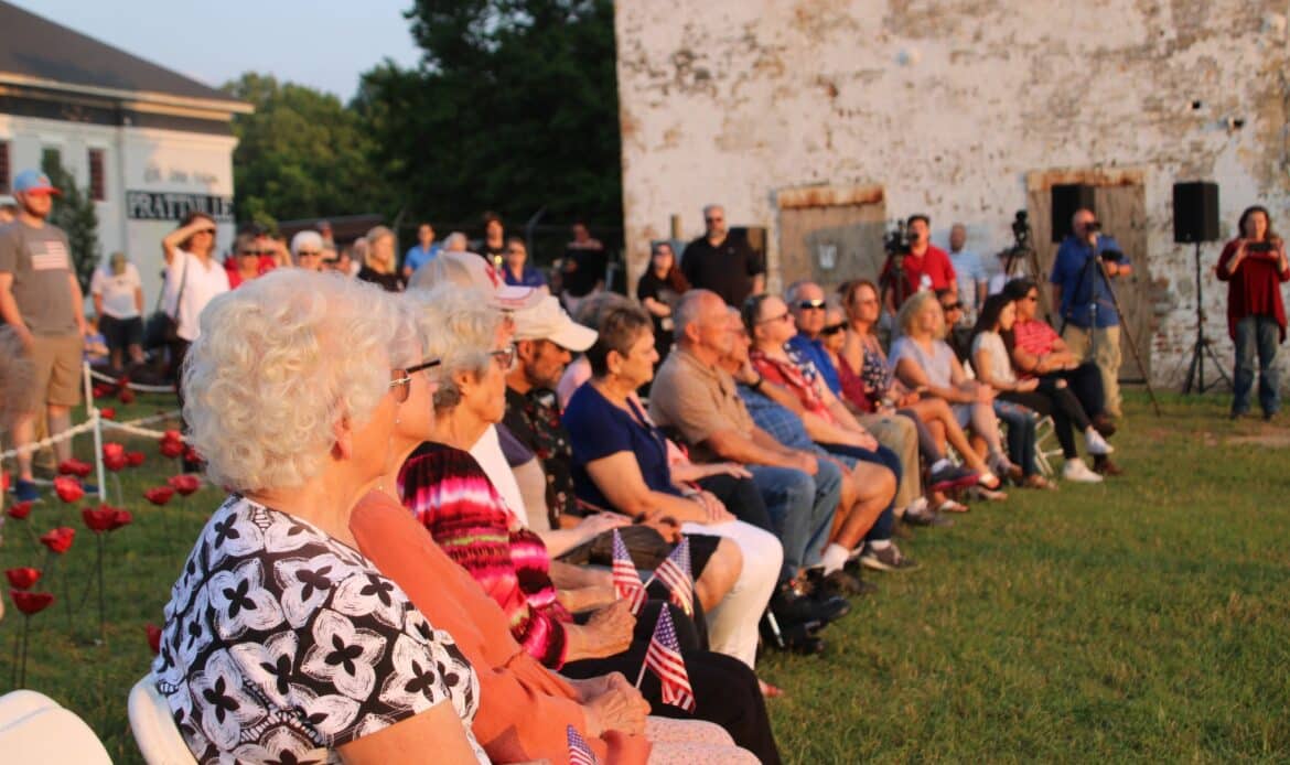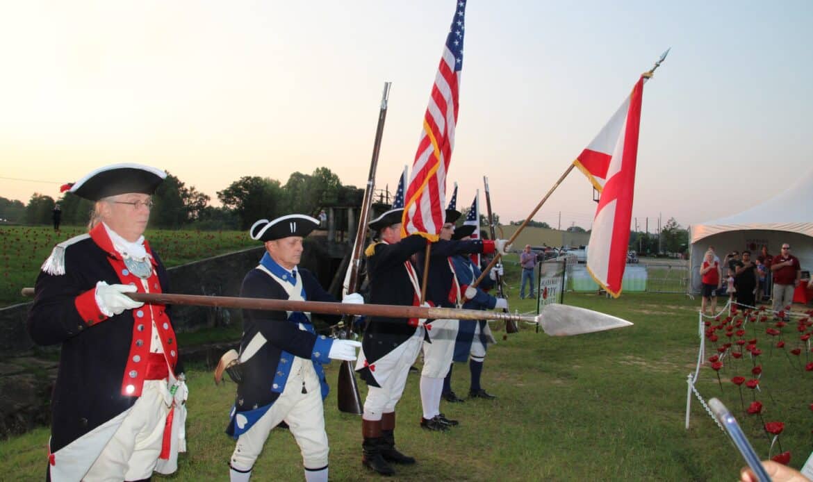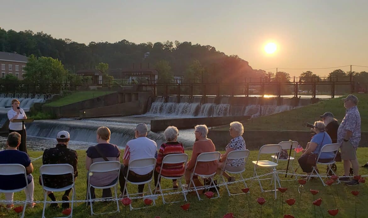 Fields of ceramic, handmade poppies are planted next to Autauga Creek and historic buildings. Each represents the life of a service man or woman who died in service, or has since died.