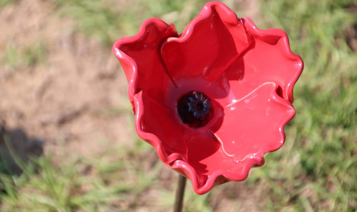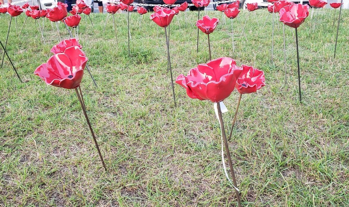 In 2020, Julianne and Steven Hansen worked tirelessly along with Hansen Fine Art staff and volunteers to roll, cut, shape, glaze, kiln fire and “plant” over 1,000 ceramic poppies in just a few months, all while a worldwide pandemic basically shut down virtually all Memorial Day celebrations. While her gallery, Hansen Fine Art & Pottery, was closed during state mandated shut-downs, Julianne was still able to keep her employees busy working independently at her gallery studio, while making the poppies at her home studio. Steven, who usually works at Maxwell Air Force Base, was working remotely from home during the day and handling the glazing and two kiln firings each poppy needed prior to being ready for the outdoor exhibit.