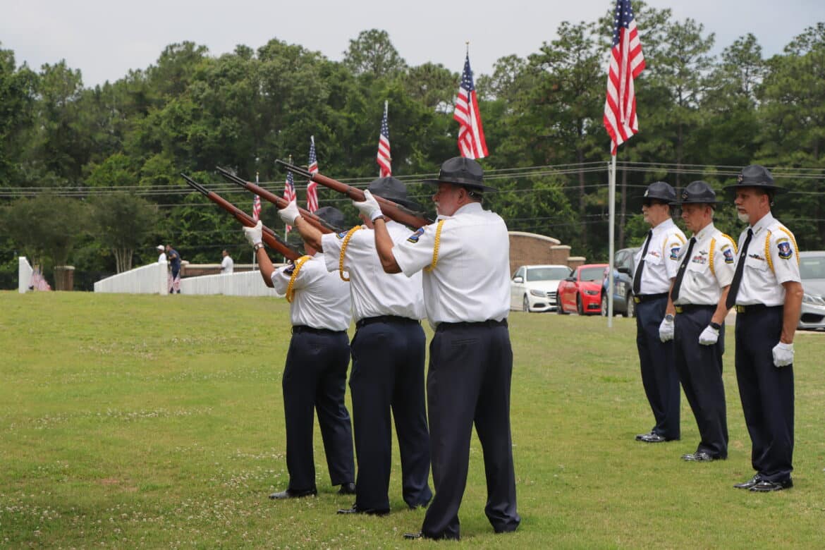 The commemoration featured a wreath-laying ceremony, accompanied by folding of an American Flag, a moment of silence followed by a rifle volley, the playing of Taps, and an Honor Guard salute. The cemetery also had an American flag at the grave of each fallen Alabama veteran, which were placed by local members of the Cub Scouts and Boy Scouts of America and volunteers from the community.