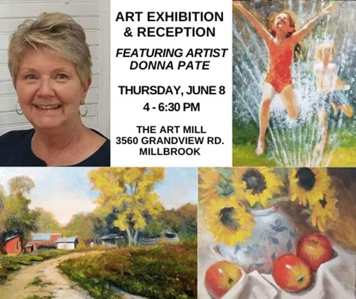 The community is invited to an art exhibition and reception featuring artist Donna Pate. The event will be Thursday, June 8, from 4-6:30 p.m. at the Millbrook Art Mill. The address is 3560 Grandview Road.